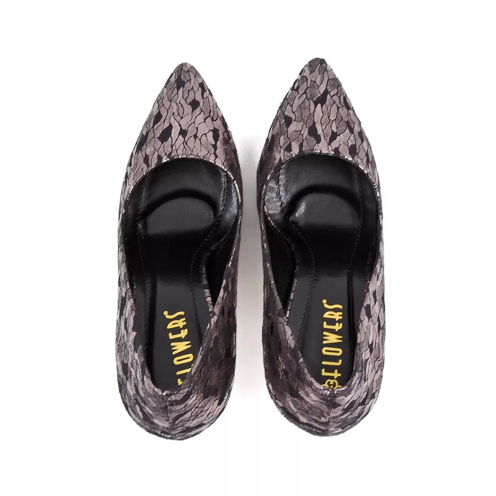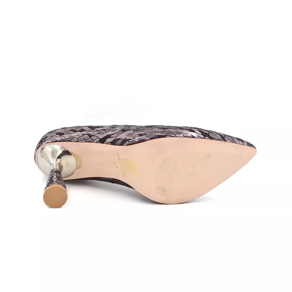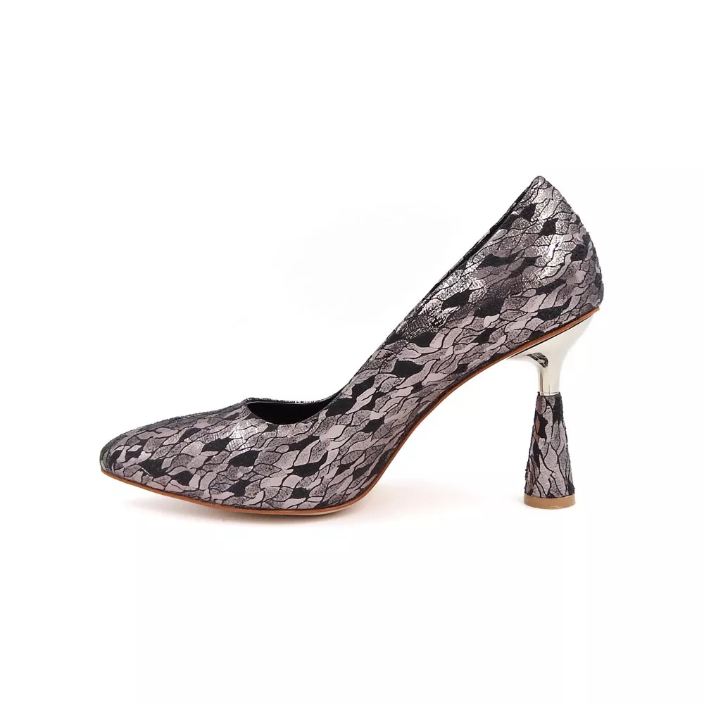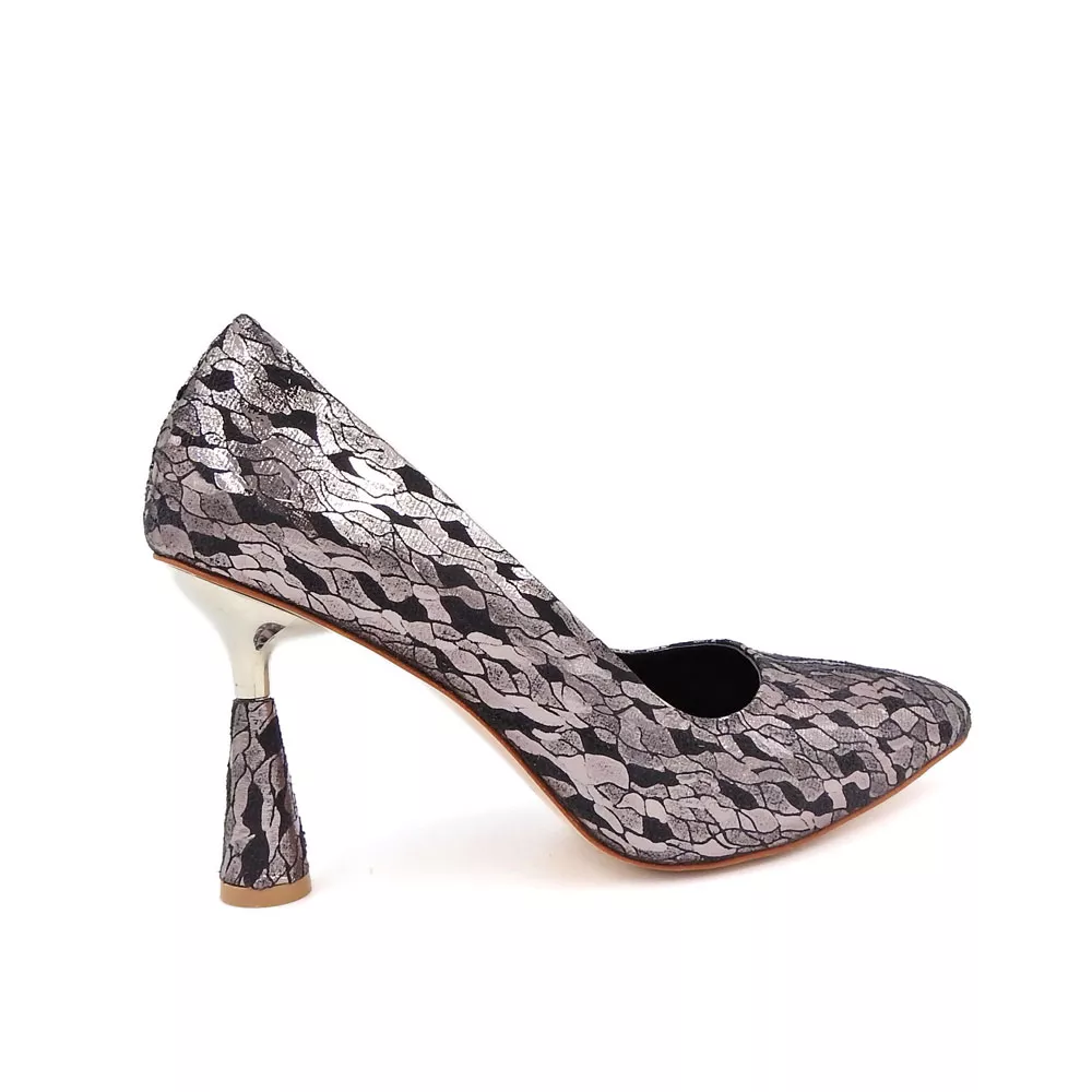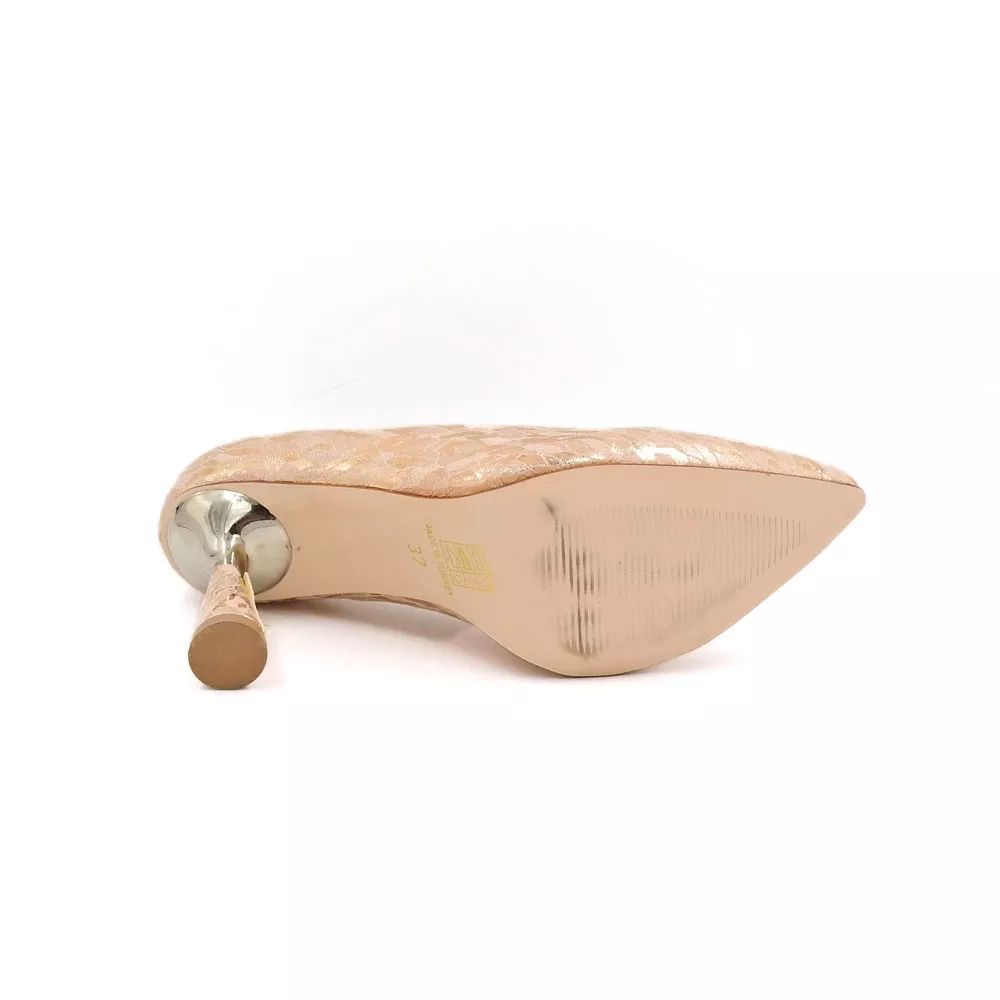 رویه کفش از چرم مصنوعی طرحدار با بافت متالیک براق ساخته شده که در نور جلوهای طلاییـصورتی به خود میگیرد. این سطح براق با الگوی ظریف و هماهنگ خود، حس درخشش و ظرافت را همزمان القا میکند. طراحی نوک تیز کفش نیز با کشیدگی ظاهری خود، پا را باریکتر نشان داده و استایلی کلاسیک و زنانه ایجاد میکند.