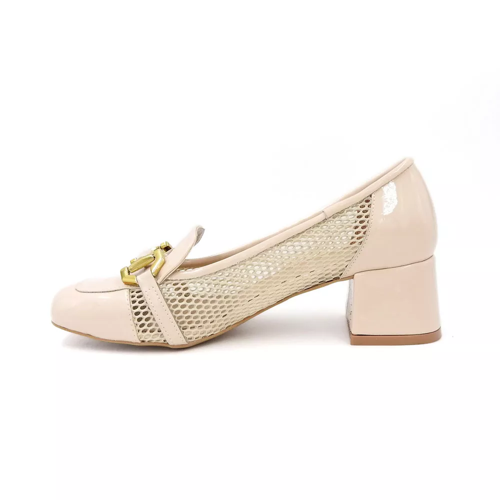 در قسمت جلویی کفش، سگک فلزی طلایی (در مدل بژ) و نقرهای (در مدل مشکی) بهصورت متقارن قرار گرفتهاند. این جزئیات فلزی علاوه بر جنبهی تزئینی، هویت ظاهری کفش را کاملاً متمایز کردهاند. تضاد بین بافت براق چرم و درخشش فلز، ترکیبی از زیبایی کلاسیک و مدرن را ایجاد کرده است.