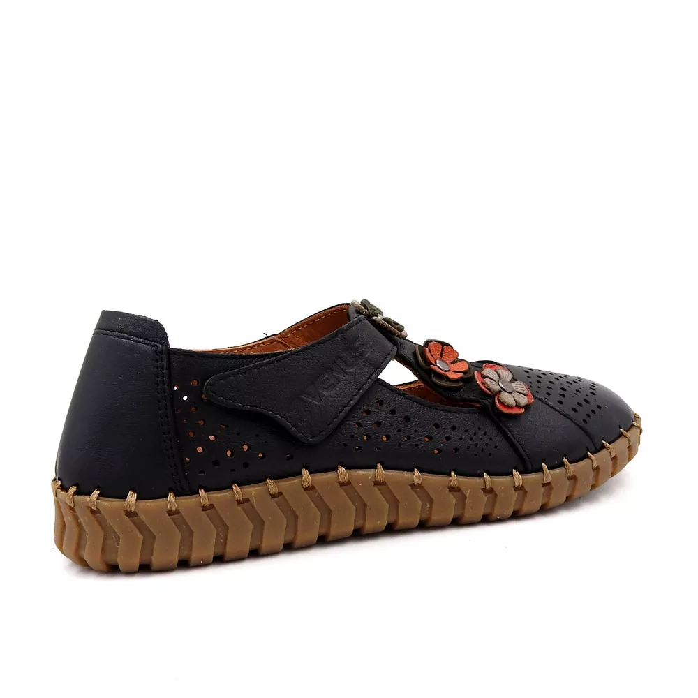 رویهی کفش از چرم طبیعی گاوی با کیفیت بالا ساخته شده که علاوه بر نرمی فوقالعاده، از دوام طولانی و قابلیت تنفس بالایی برخوردار است. وجود سوراخهای منظم در سطح رویه، به جریان هوای درون کفش کمک کرده و از تعریق و خستگی پا جلوگیری میکند. طراحی گلهای رنگی دوختهشده روی بند مرکزی کفش، جلوهای دخترانه و شاد به این مدل داده است؛ ترکیبی از رنگهای ملایم مانند سبز و نارنجی که هماهنگی چشمنوازی با زمینهی مشکی کفش ایجاد میکنند.