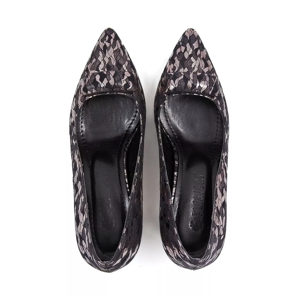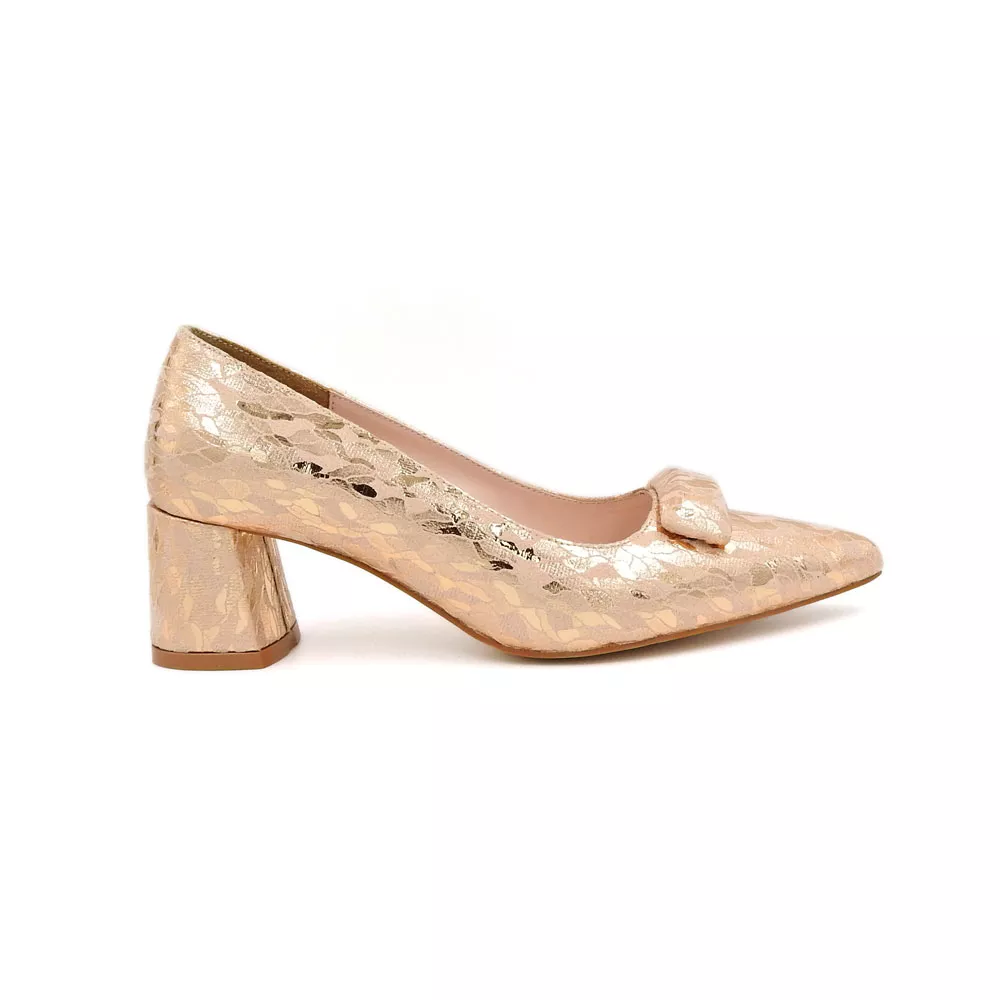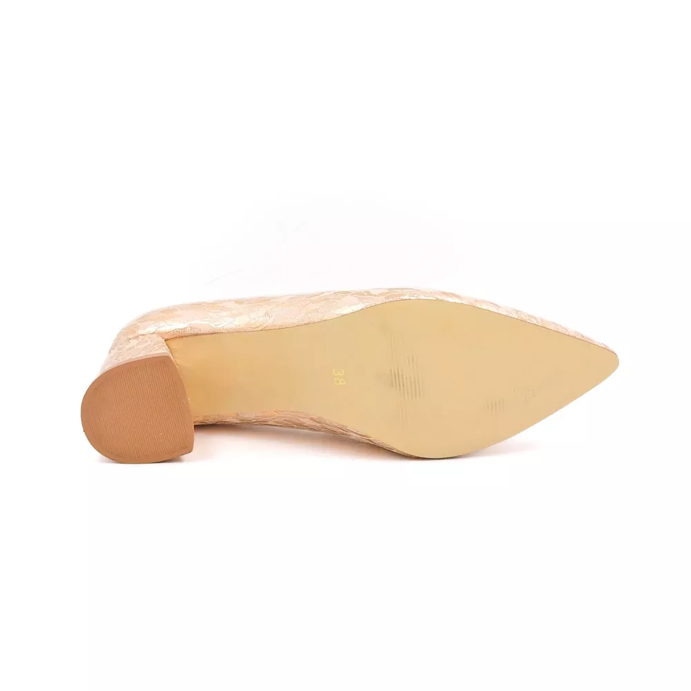 جنس رویه کفش از چرم مصنوعی مرغوب با بافت براق و طرحدار ساخته شده است. این بافت خاص، ترکیبی از نقشهای لطیف برگمانند در دو رنگ متالیک و مات دارد که جلوهای لوکس و فریبنده به کفش میبخشد. درخشندگی ملایم سطح رویه در زیر نور، زیبایی کفش را چند برابر کرده و آن را به گزینهای مناسب برای مجالس شبانه و رسمی تبدیل میکند.