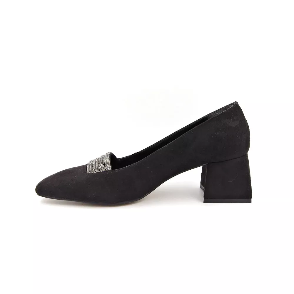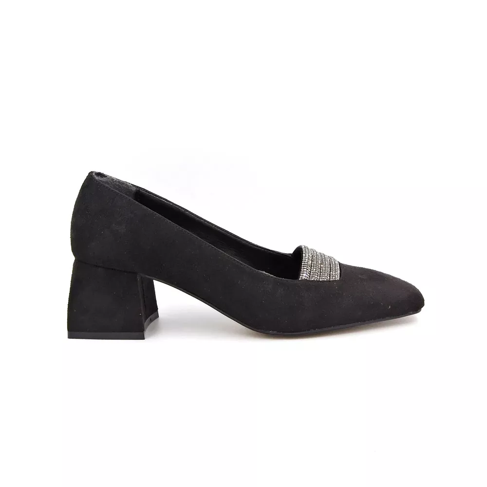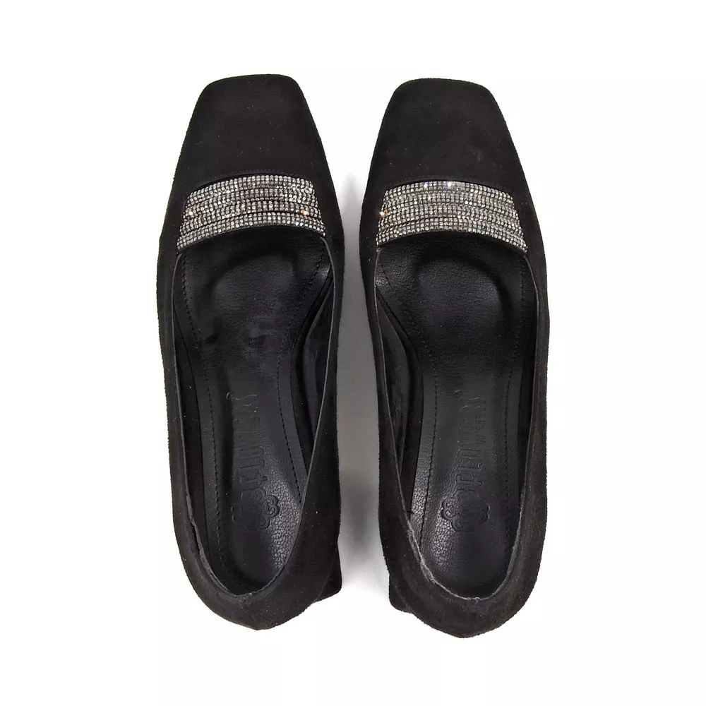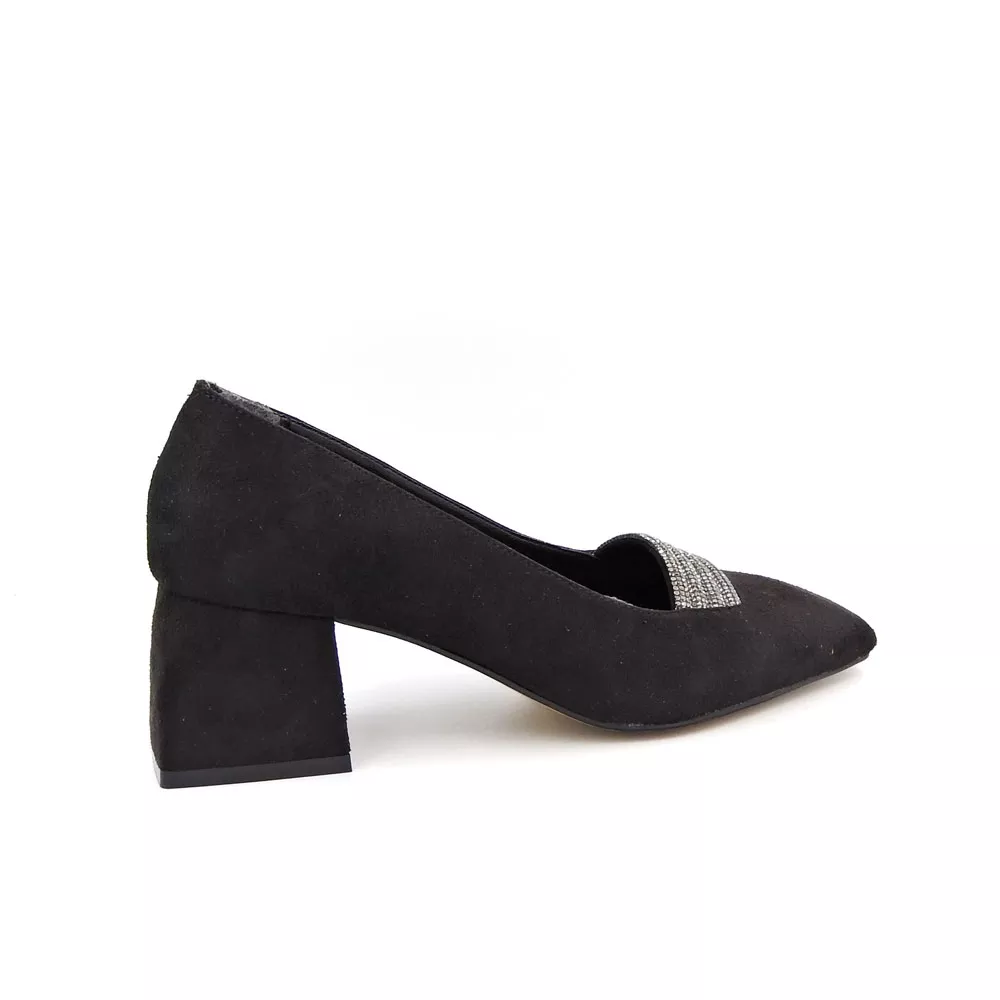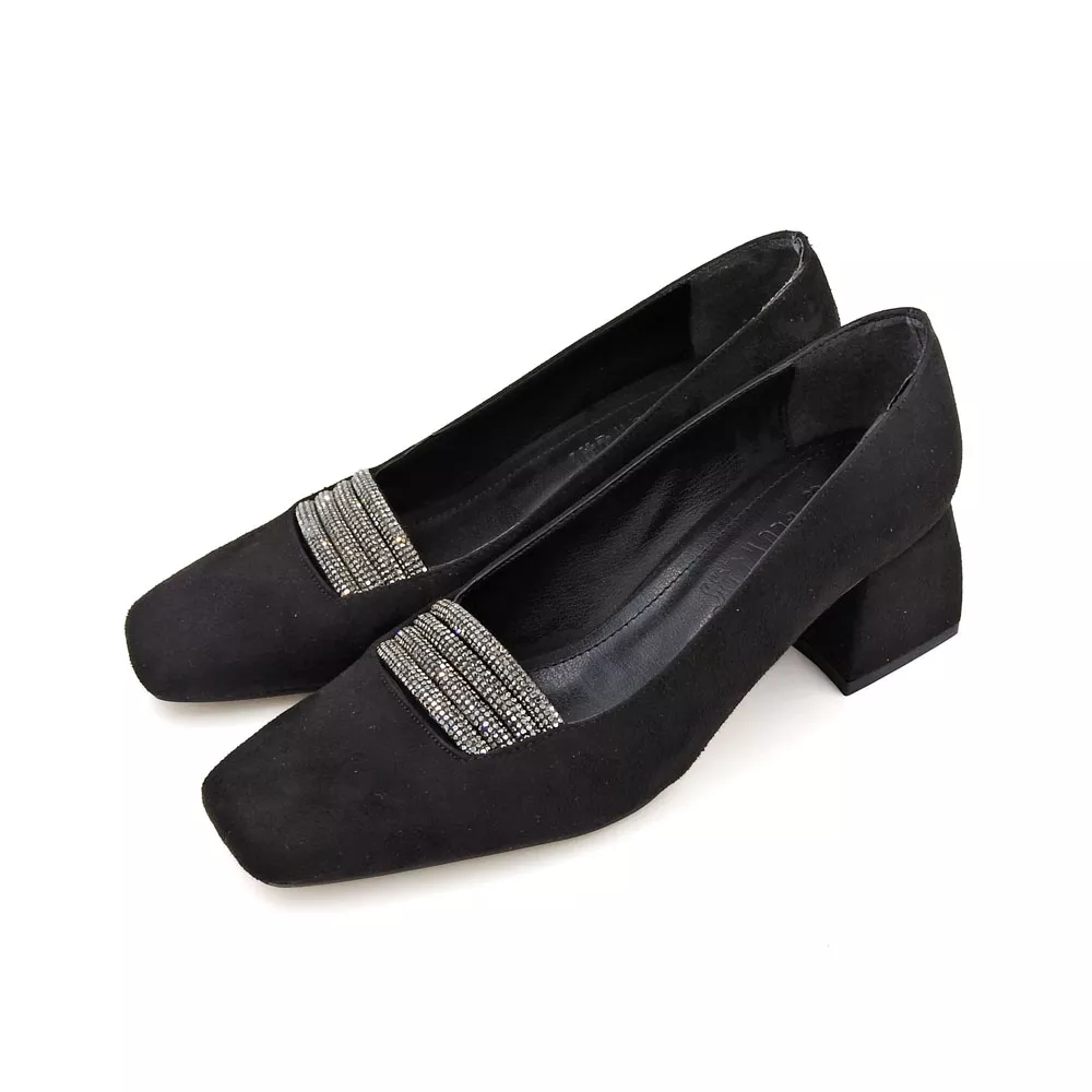 کفش زنانه مجلسی کد 1241 با طراحی کلاسیک و رنگ مشکی شیک، ترکیبی از وقار و راحتی است. پاشنه ۴ سانتی، رویه مخملی با نگین‌های ظریف و زیره داووس، استایلی شیک و ماندگار را می‌سازد.