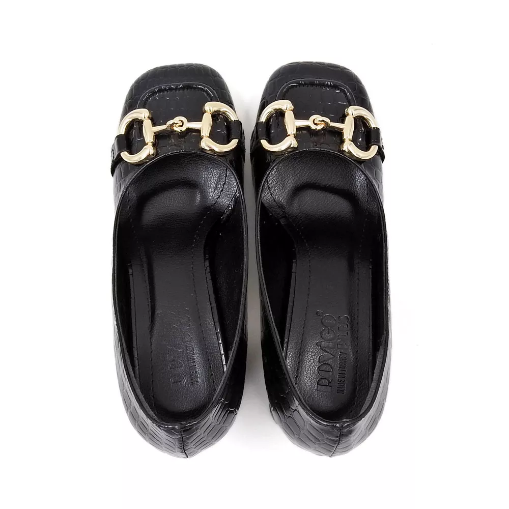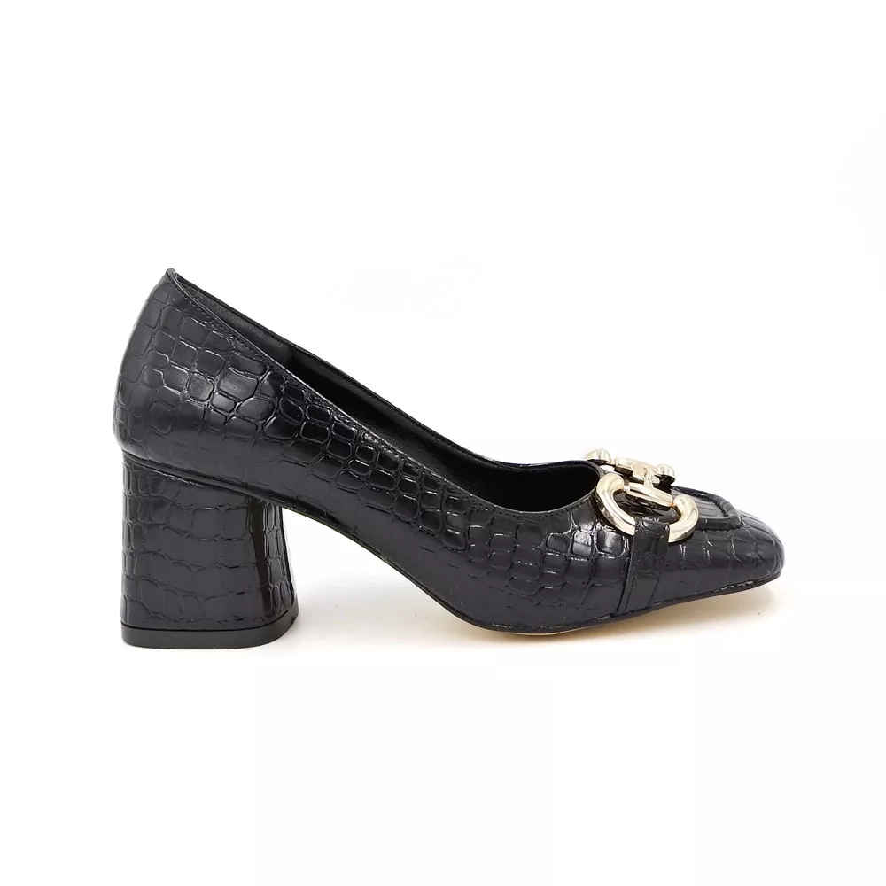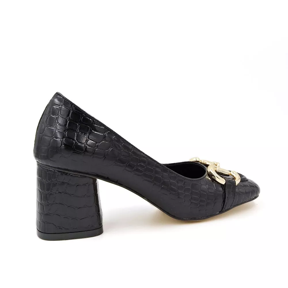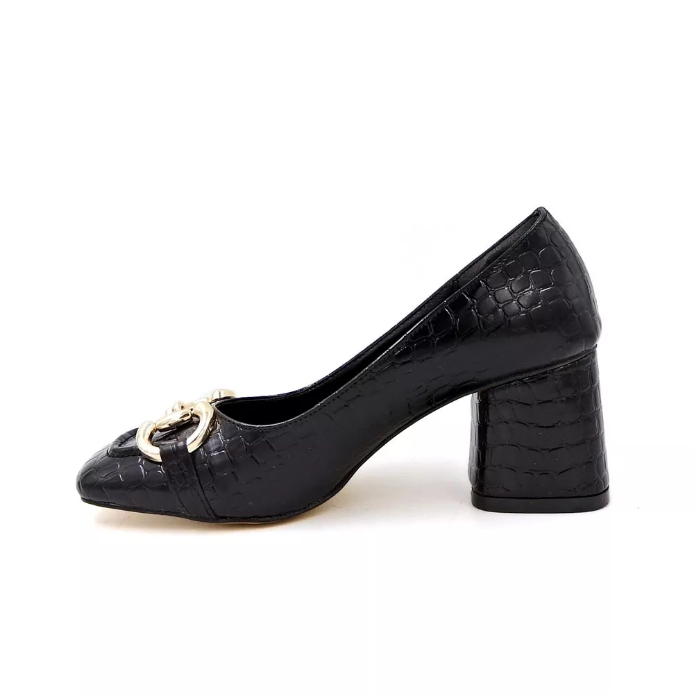 کفش زنانه مجلسی کد 1306 با طراحی کلاسیک و رویه مشکی ورنی طرح پوست کروکودیل، پاشنه ۵ سانتی و سگک طلایی لوکس، انتخابی شیک و راحت برای مجالس رسمی و استایل‌های کلاسیک است.