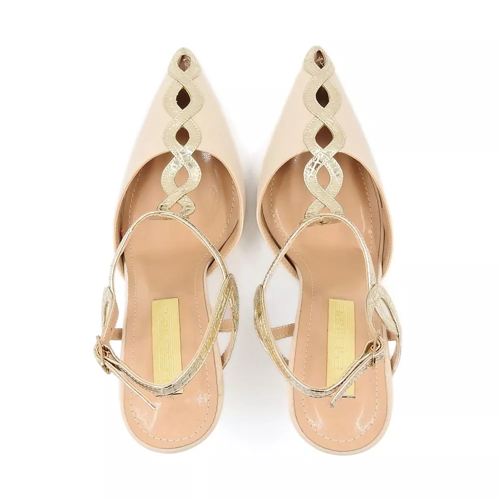 در بخش رویه، بندهای طلایی با طرح موجی و ظریف از روی پنجه تا قوزک پا امتداد یافتهاند. این بندها که با دقت و ظرافت خاصی دوخته شدهاند، نهتنها نقش تزئینی دارند بلکه باعث میشوند کفش بهصورت محکم و راحت روی پا فیکس شود. طراحی ضربدری بندها، فرم پا را کشیدهتر نشان داده و ظاهری بسیار جذاب و ظریف به استایل شما میبخشد.