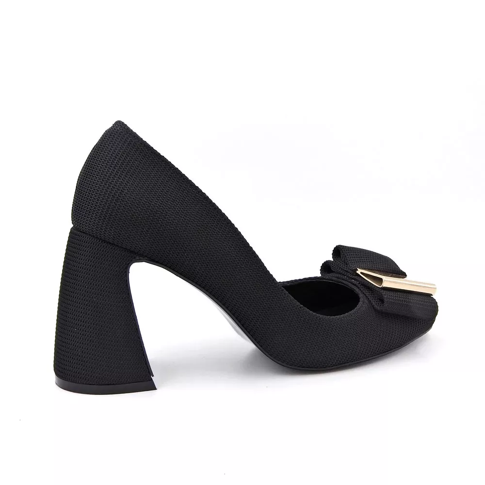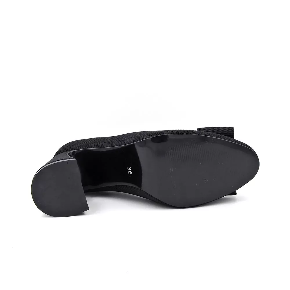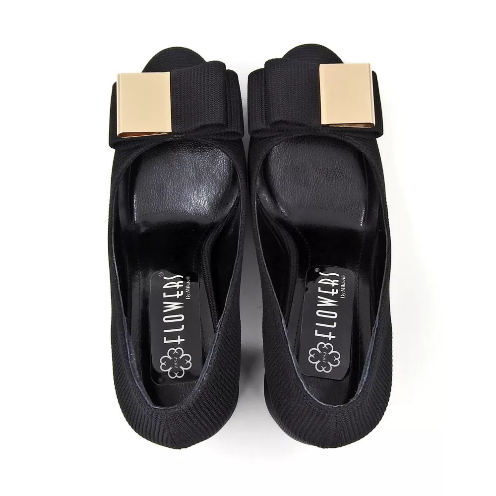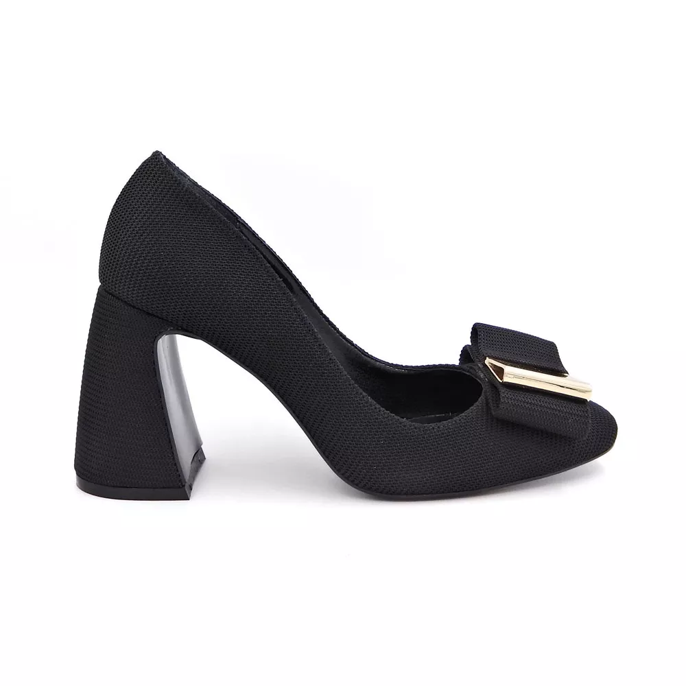 کفش زنانه مجلسی کد 1361 با طراحی پارچهای ظریف و پاپیون طلایی براق در قسمت جلو، انتخابی شیک و مدرن برای استایلهای رسمی است. پاشنهی پهن ۵ سانتیمتری آن راحتی و ثبات را تضمین میکند.