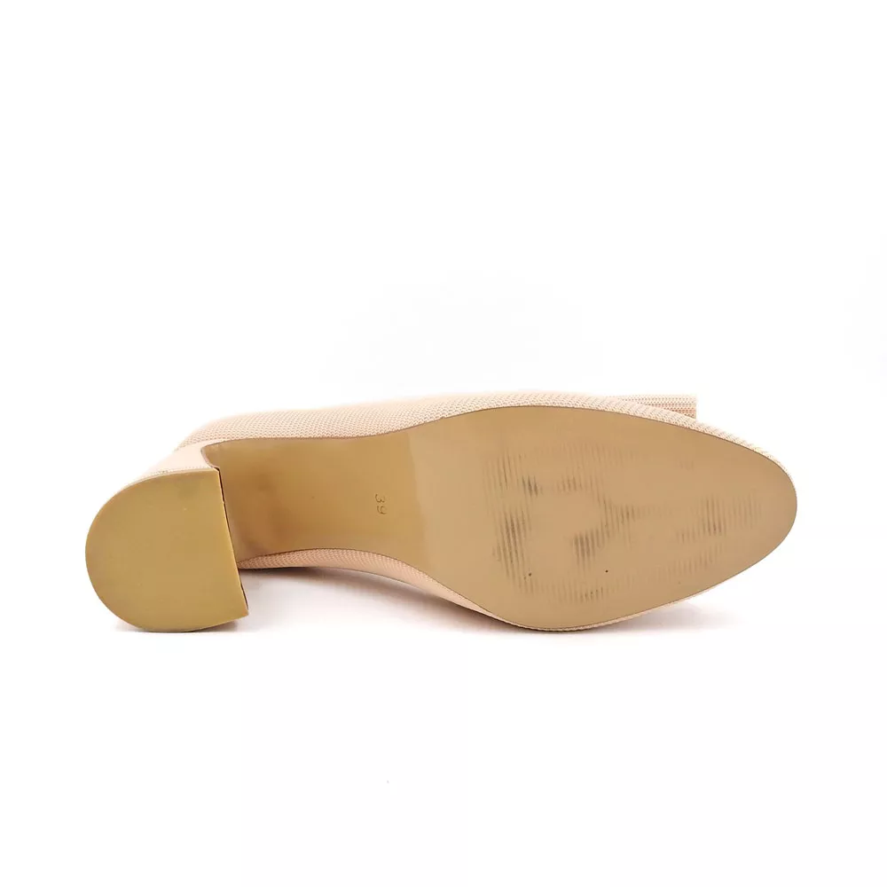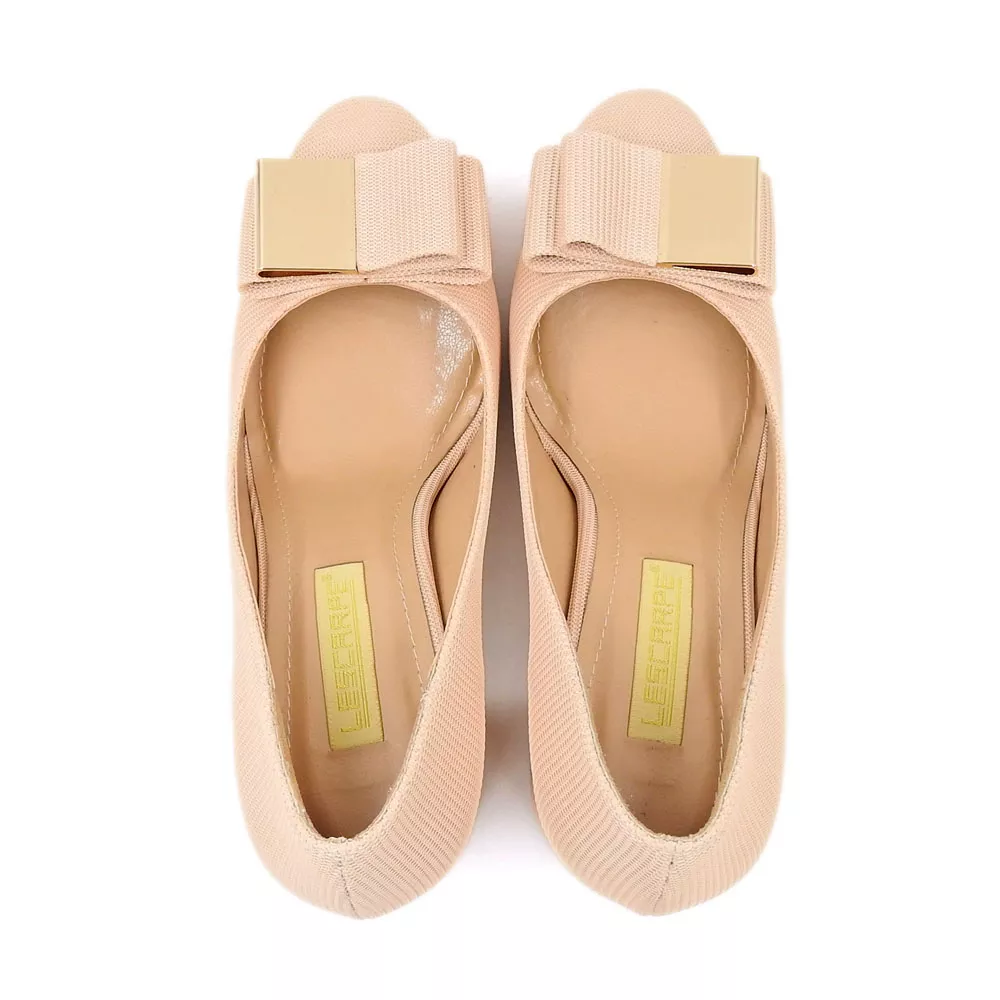 رویه کفش از جنس پارچه تکستیل با بافت ریز و متراکم ساخته شده که ظاهری لطیف و زنانه دارد. این جنس علاوه بر زیبایی، خاصیت تهویه مناسب دارد و از ایجاد گرما و تعریق در پا جلوگیری میکند. در قسمت جلوی کفش، یک پاپیون بزرگ پارچهای با تزئین فلز طلایی براق قرار گرفته که نمادی از ظرافت و جذابیت است و کفش را از حالت ساده به مدلی خاص و لوکس تبدیل میکند.