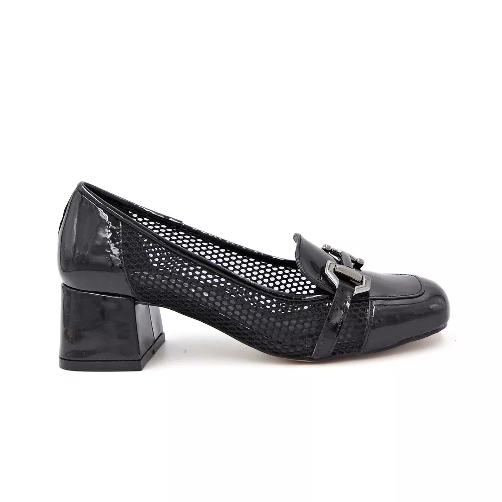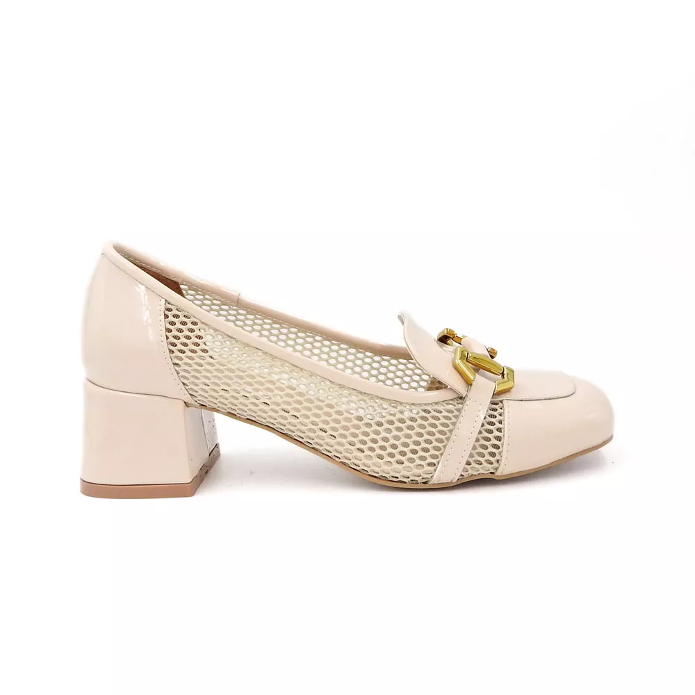 در قسمت جلویی کفش، سگک فلزی طلایی (در مدل بژ) و نقرهای (در مدل مشکی) بهصورت متقارن قرار گرفتهاند. این جزئیات فلزی علاوه بر جنبهی تزئینی، هویت ظاهری کفش را کاملاً متمایز کردهاند. تضاد بین بافت براق چرم و درخشش فلز، ترکیبی از زیبایی کلاسیک و مدرن را ایجاد کرده است.